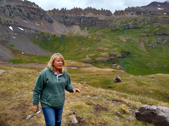We reach Yankee Boy Basin nestled beneath some of the San Juan's most breathtaking peaks; in the background is Mount Sneffels. Sherry is delighted with the open basin and the breadth of scenery. The Uncompahgre River snakes through a deep and narrow gorge.